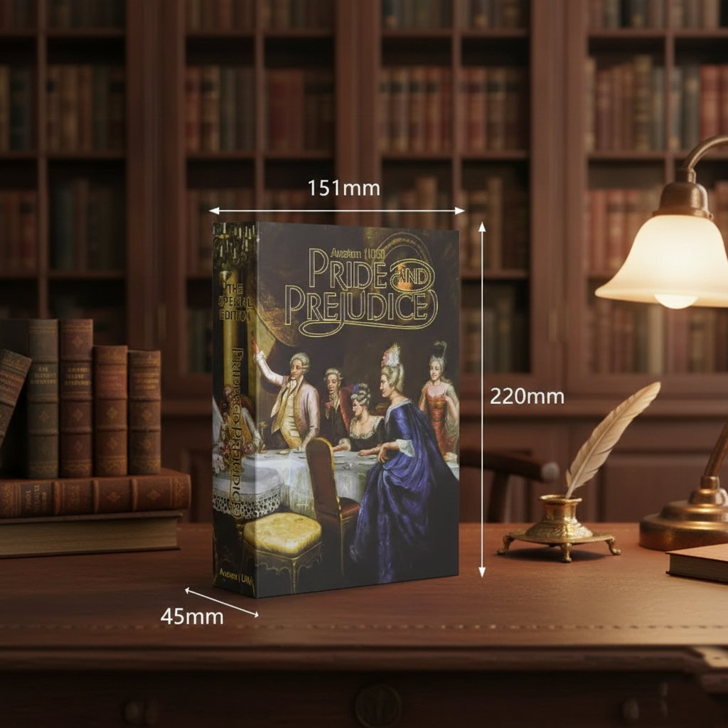 Coffre-fort pour bijoux modèle Pride & Prejudice, en forme de livre discret avec clé de sécurité. Dimensions : 22 x 15,1 x 4,5 cm, poids 700 g, parfait pour un rangement sécurisé.